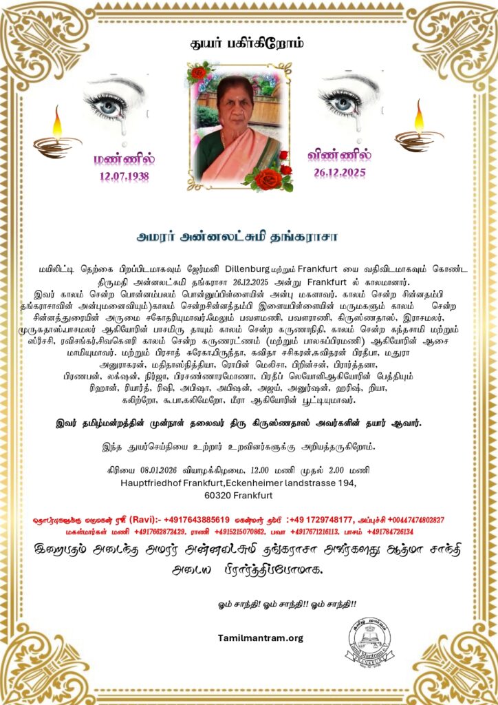 அமரர் அன்னலட்சுமி தங்கராசா , இவர் தமிழ்மன்றத்தின் முன்நாள் தலைவர் திரு கிருஸ்ணதாஸ் அவர்களின் தயார் ஆவார். ravishankar 4 weeks ago